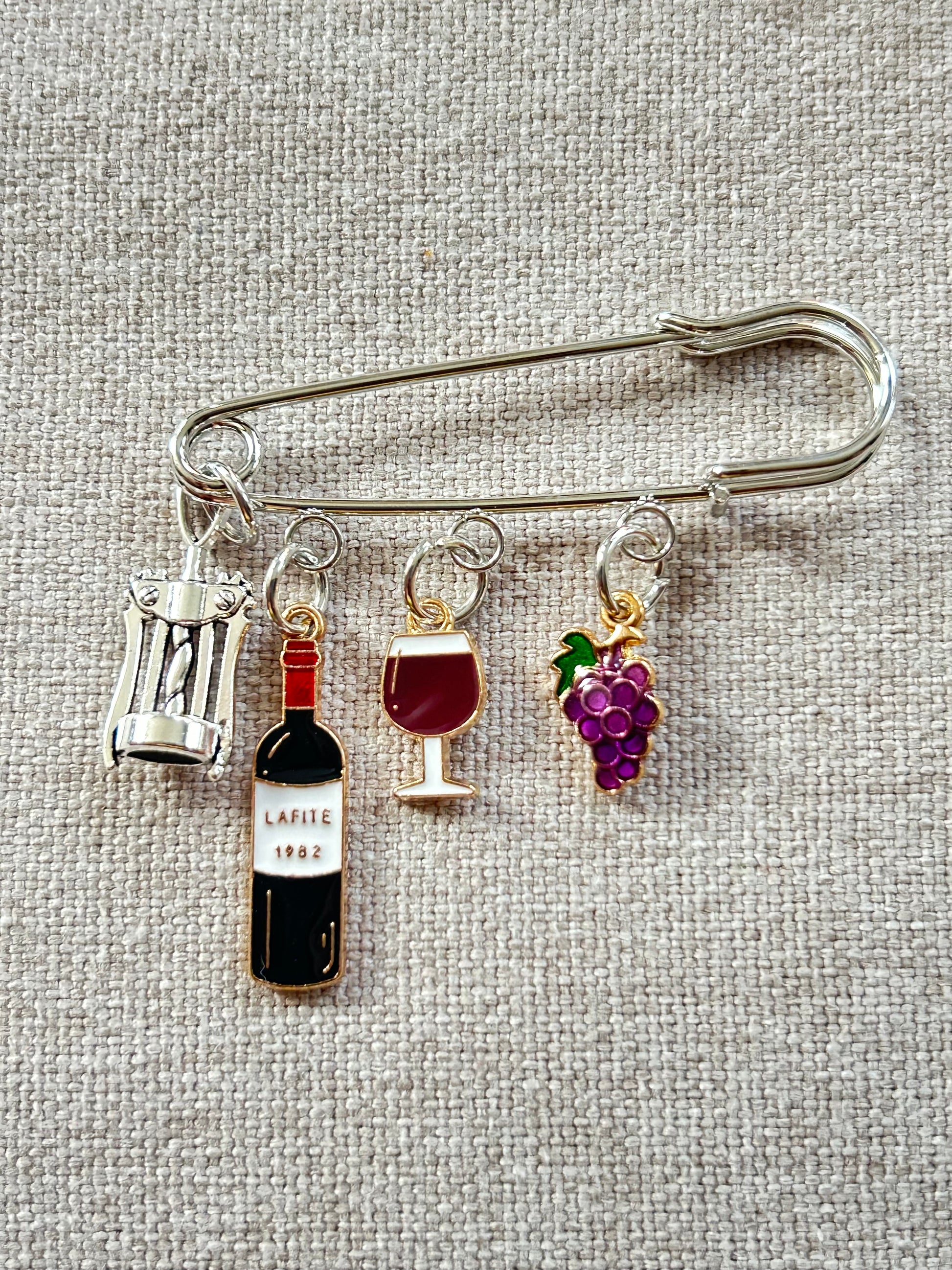Experience the joy of wine with our All About The Vine Brooch. This elegant piece features wine-inspired charms - a wine bottle, wine glass, grapes, and bottle opener. Perfect for wine lovers, it adds a touch of sophistication to any outfit. Cheers to style and taste!