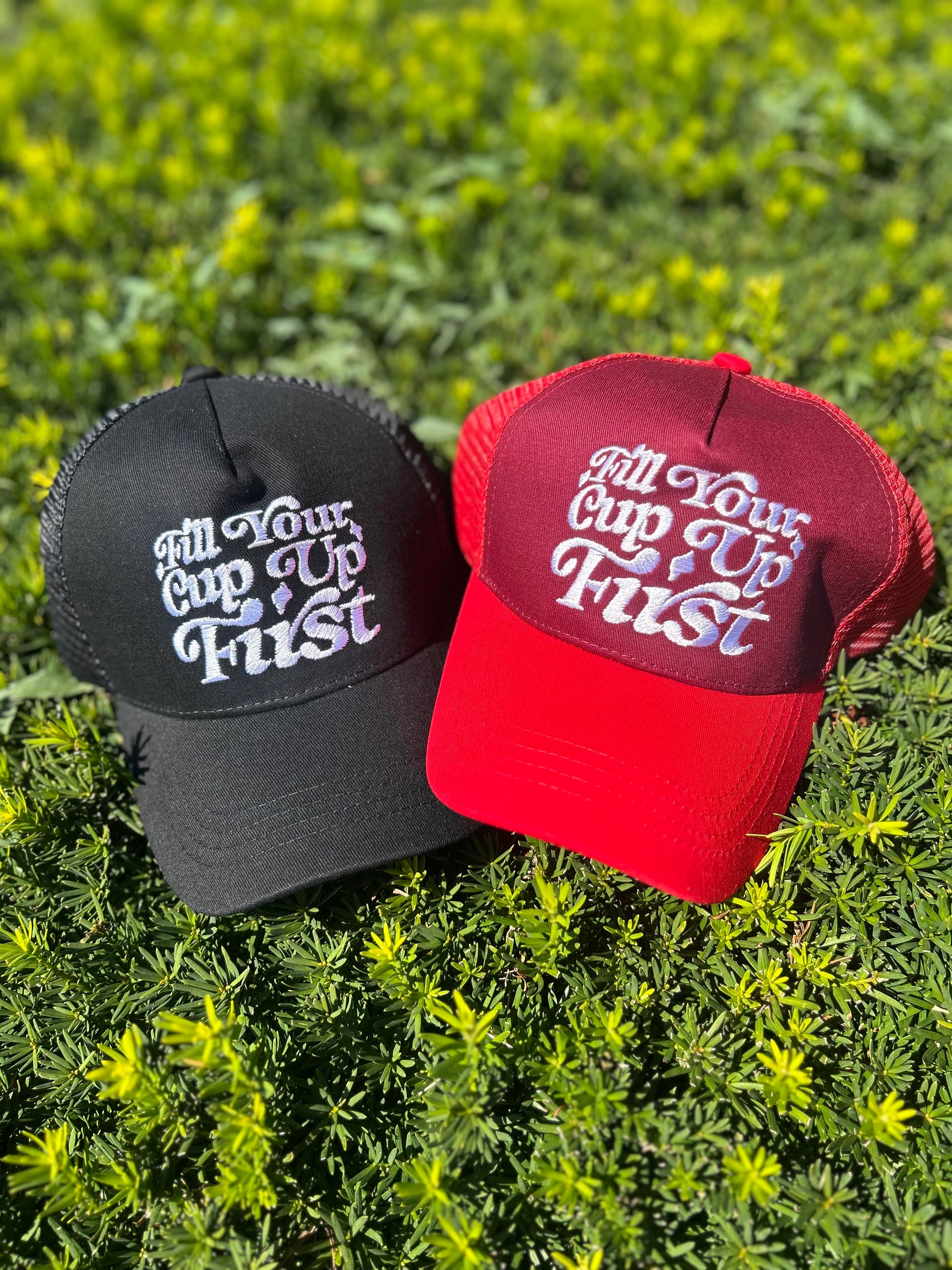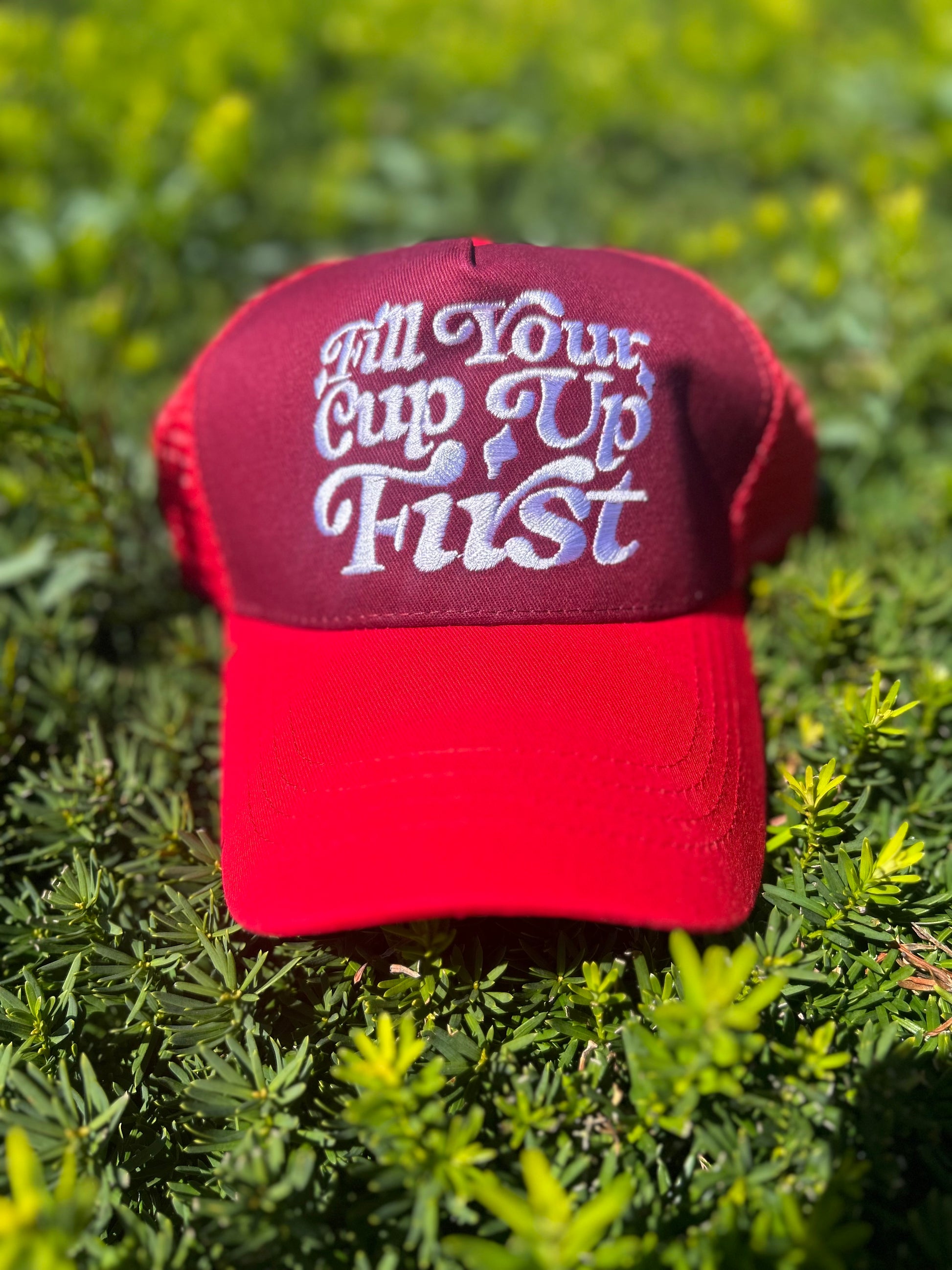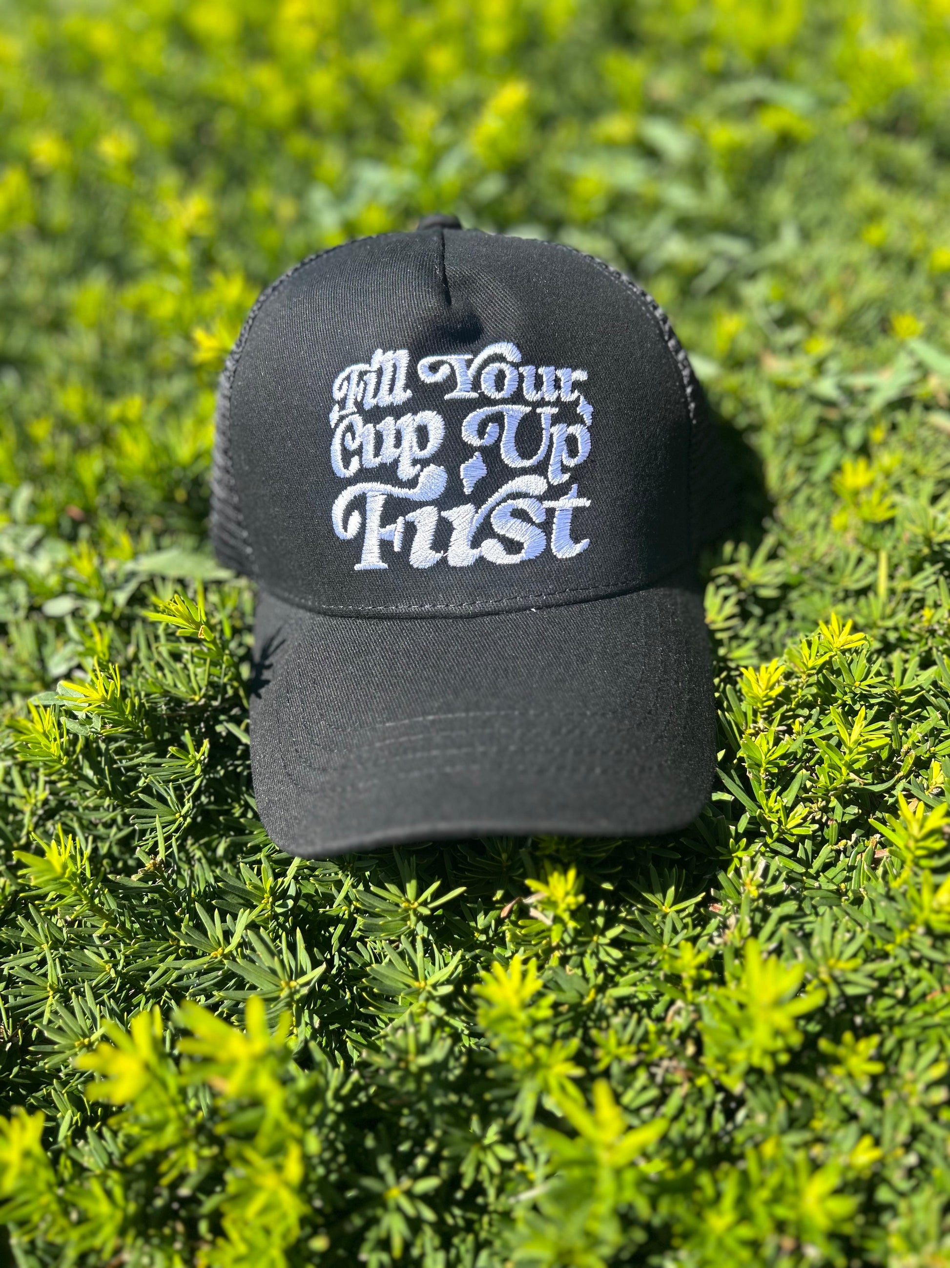 Embroidered “Fill Your Cup Up First” design for a bold look